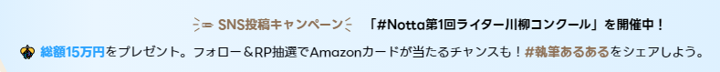 「#Notta第1回ライター川柳コンクール」は人気開催中!🎊 総額15万円の賞金を進呈します。また、フォロー&RP抽選でAmazonカードが当たるチャンスもあります!