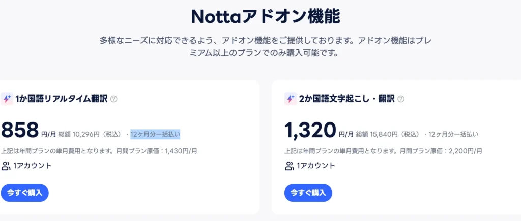Nottaには、リアルタイム翻訳可能なアドオン機能も提供します。1か国語翻訳したら、 572円オフ(原価1,430円/月)で、2か国語文字起こし・翻訳したら、880円オフ(原価2,200円/月)にします。でも、それぞれもプレミアムプラン以上のプランだけ購入できます。しかも、12ヶ月分一括払います。