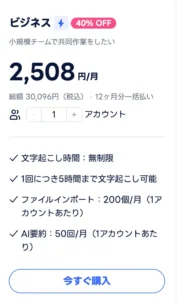 プレミアムプランは、1 ユーザー向けの包括的な文字起こしパッケージです。 今、年間プレミアムプランは40%割引のキャンペーン実施中です。割引後の値段は総額 15800円です。12ヶ月分一括払いで購入すると月額1317円だけで利用できます。