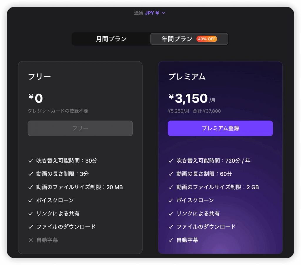 | 年間プラン | 吹き替え可能時間:720分/年 動画の長さ、ファイルサイズ制限:60分・2GB ボイスクローン ファイルのダウンロード、共有 | 3,150円/月 合計37,800円 | 5,250円/月 合計63,000円 | 40%オフ |