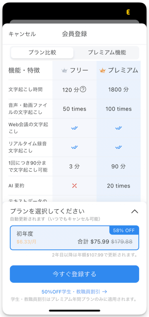 Nottaのアプリをダウンロードした場合は、デバイスから購入すると、初めての一年に58%オフの割引価格が受けられます。つまり、原価179.88ドルの年間プランは75.99ドルだけで利用できます。1ヶ月に6.33ドルで利用できます。