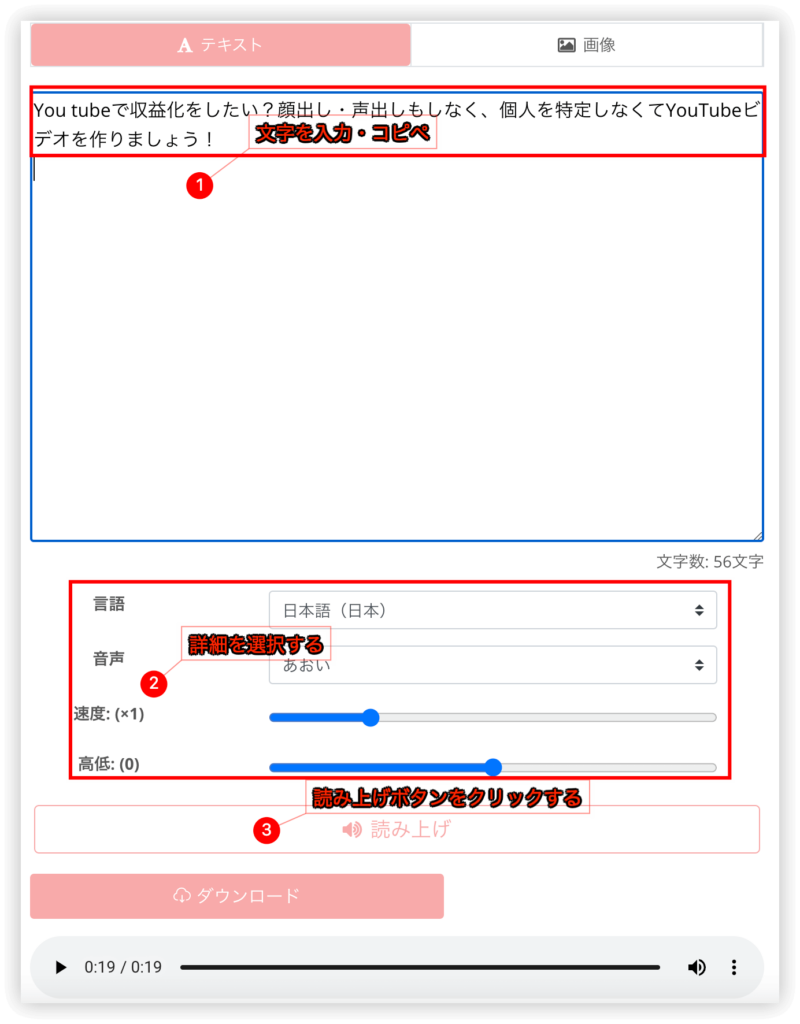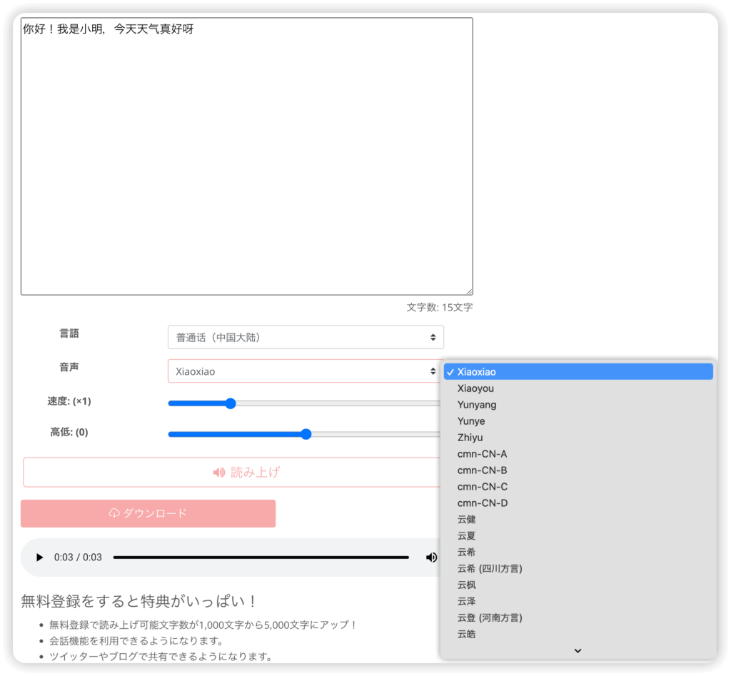 Step2:言語、音声、速度、高低などを選択して、読み上げボタンをクリックします。