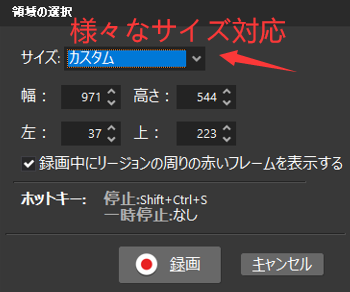 録画モード:フルスクリーン、選択範囲、ウィンドウ