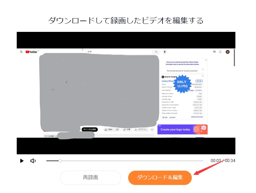 動画編集については、画面を録画したあと、「ダウンロード&編集」ボタンをクリックすると、動画をダウンロードするとともに、編集画面に入ります。この画面で、動画の編集、例えば、音楽追加、テキスト、字幕追加、カバー追加、トランジションなどができます。ただし、編集された動画をダウンロードするには、新規登録が必要です。