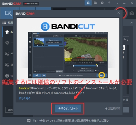 ただし、もし録画された動画を編集したい場合、別途「Bandicut」というソフトをインストールする必要があるようです。無料版も10分の制限もあります。