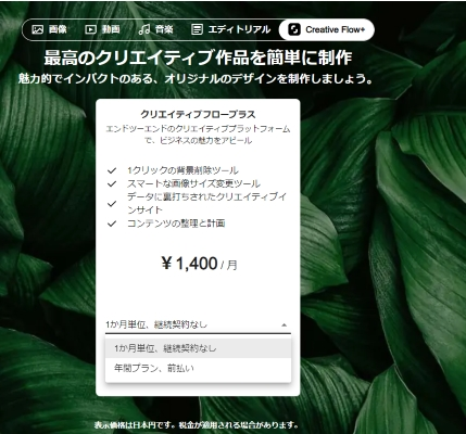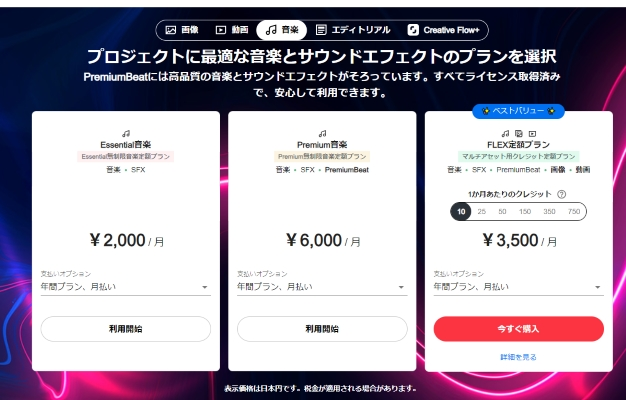 音楽やエディトリアル、Creative Flow+の場合は、プランにより値段も違います。詳細は次の画像を参考にしてください。