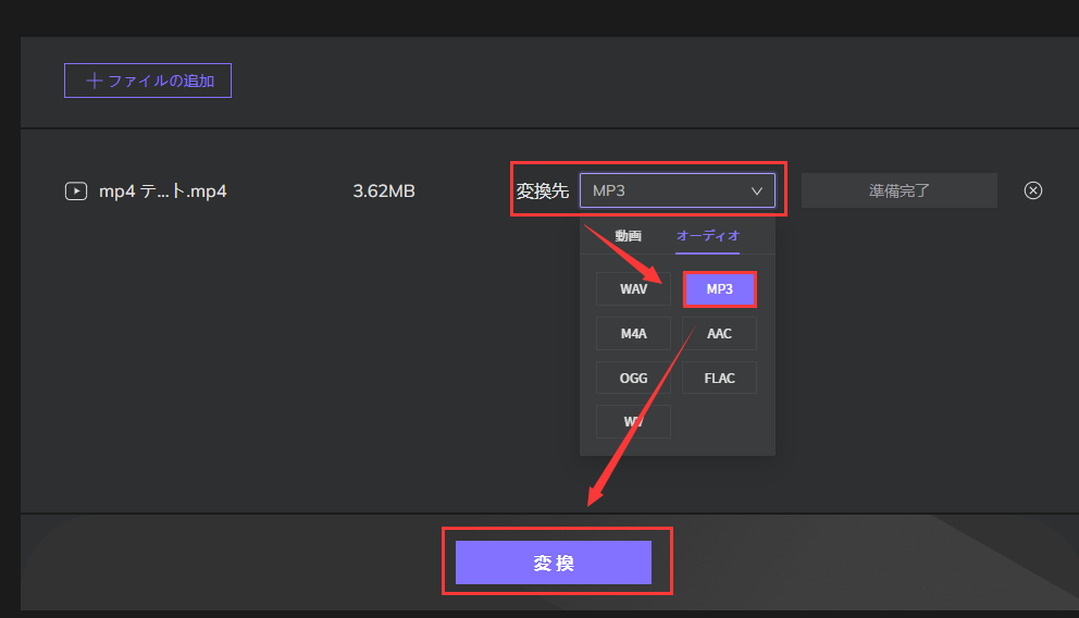 ステップ 2:変換先をMP3に指定して、「変換」ボタンをクリックして、mp4をMP3に変換できます。