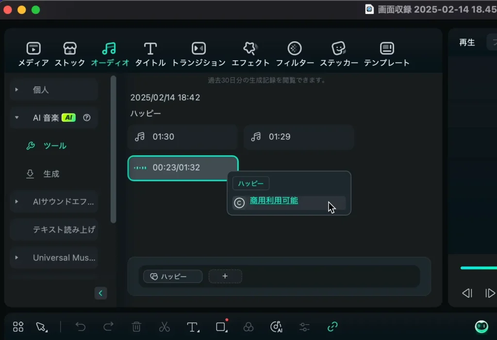 A. FilmoraのAIツールを利用して生成した音楽は「商用利用可能」とラベル付けされたら商業利用が可能です。