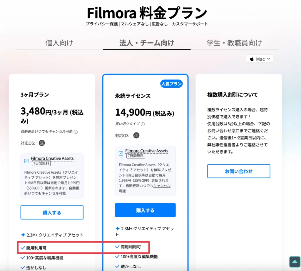 現在、「Filmora(フィモーラ)」は個人向け・法人商用ビジネス向け・学生&教職員向けの3種類に分けられます。「Filmora」の商用利用の規約は料金プランによって違います。Wondershare Filmora(フィモーラ) クーポンを利用する場合、もっと安い値段で入手できます。