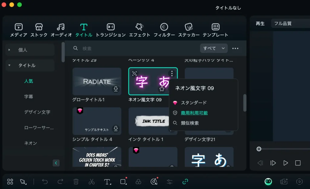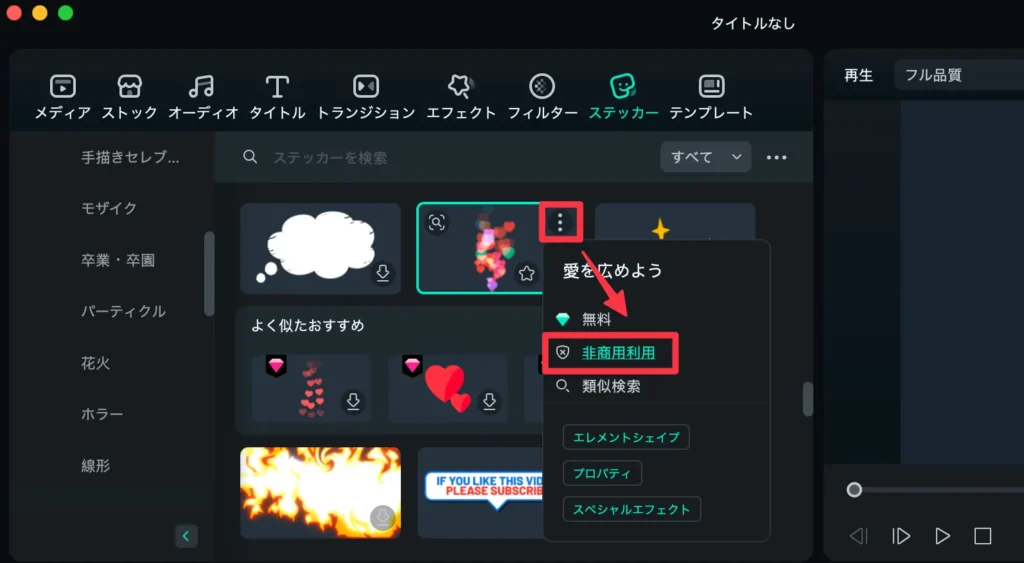 Filmoraには、ストックメディア、BGMや効果音、アニメーションエフェクトなど、動画編集に役立つ多くの素材が用意されています。しかし、すべての素材が商用利用できるわけではありません。例えば、以下のステッカーには「非商用利用」ラベルが付いています。