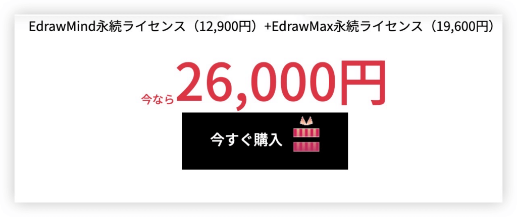 今なら、EdrawMind永続ライセンス(元の価格:12,900円)とEdrawMax永続ライセンス(元の価格:19,600円)のパッケージを購入すると、6,500円割引で、26,000円で購入できます。コスパが一番いいと思っています。日常&仕事で作図、マインドマップを作成する必要がある方は、ぜひお早めに!