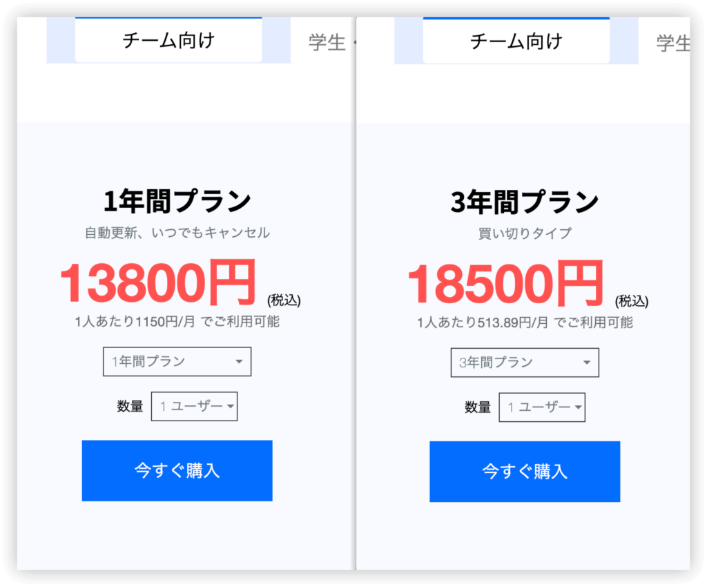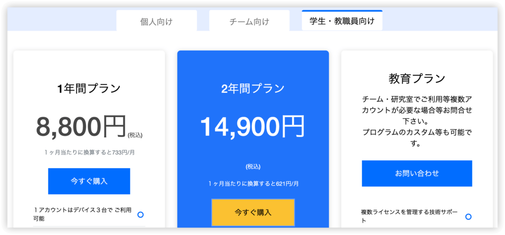 EdrawMaxも学生・教職員に向けの特典も開催しています。次の表からみると、やはり、2年プランの場合は、コスパがいいでしょう。