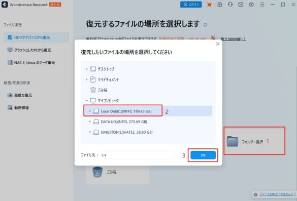 注: 復元するファイルの場所を選択する場合に、HDDや外付けデイバスだけでなく、「デスクトップ」「ごみ箱」など自由に特定のフォルダーを選択することもできます。