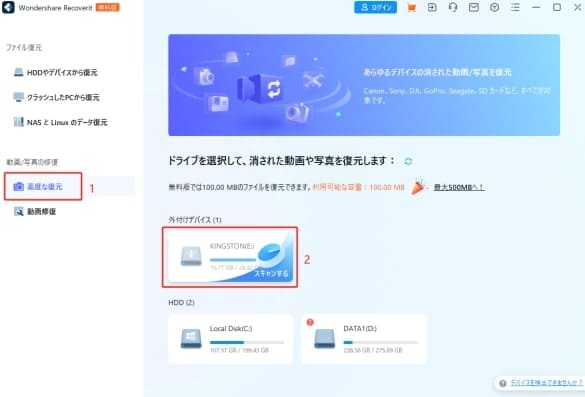 すると、Wondershare Recoveritの無料版を開き、下記の機能を体験しましょう。