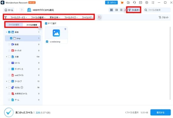 注:「ファイルの場所」&「ファイルの種類」を選択して異なる方式でファイルが展示されます。また、右上の「フォルダー」を選択すると、「ファイルステータス」「ファイルの種類」「更新日時」「ファイルサイズ」「ファイルタグ」の方式で復元したいデータを探せます。