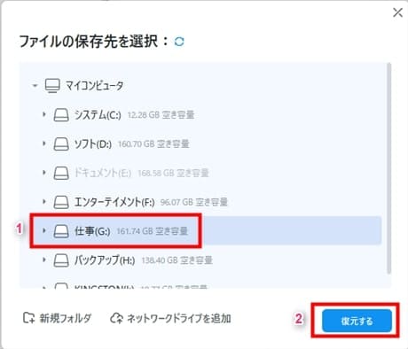 Step 6:ポップアップ画面でファイルの保存先を選択して「復元する」ボタンをクリックします。