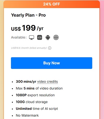 | 年間プラン – プロ | US$199 /年 | 300分間/年のビデオクレジット最大5分間のビデオ100Gクラウドストレージ | 24% |